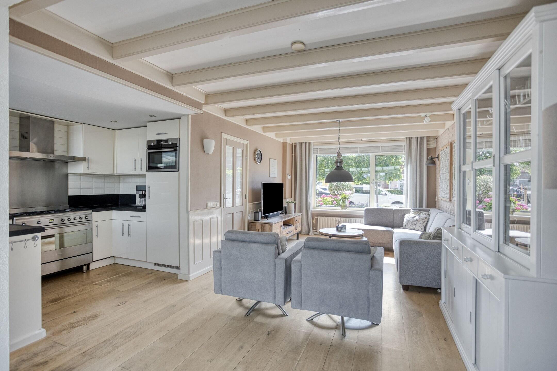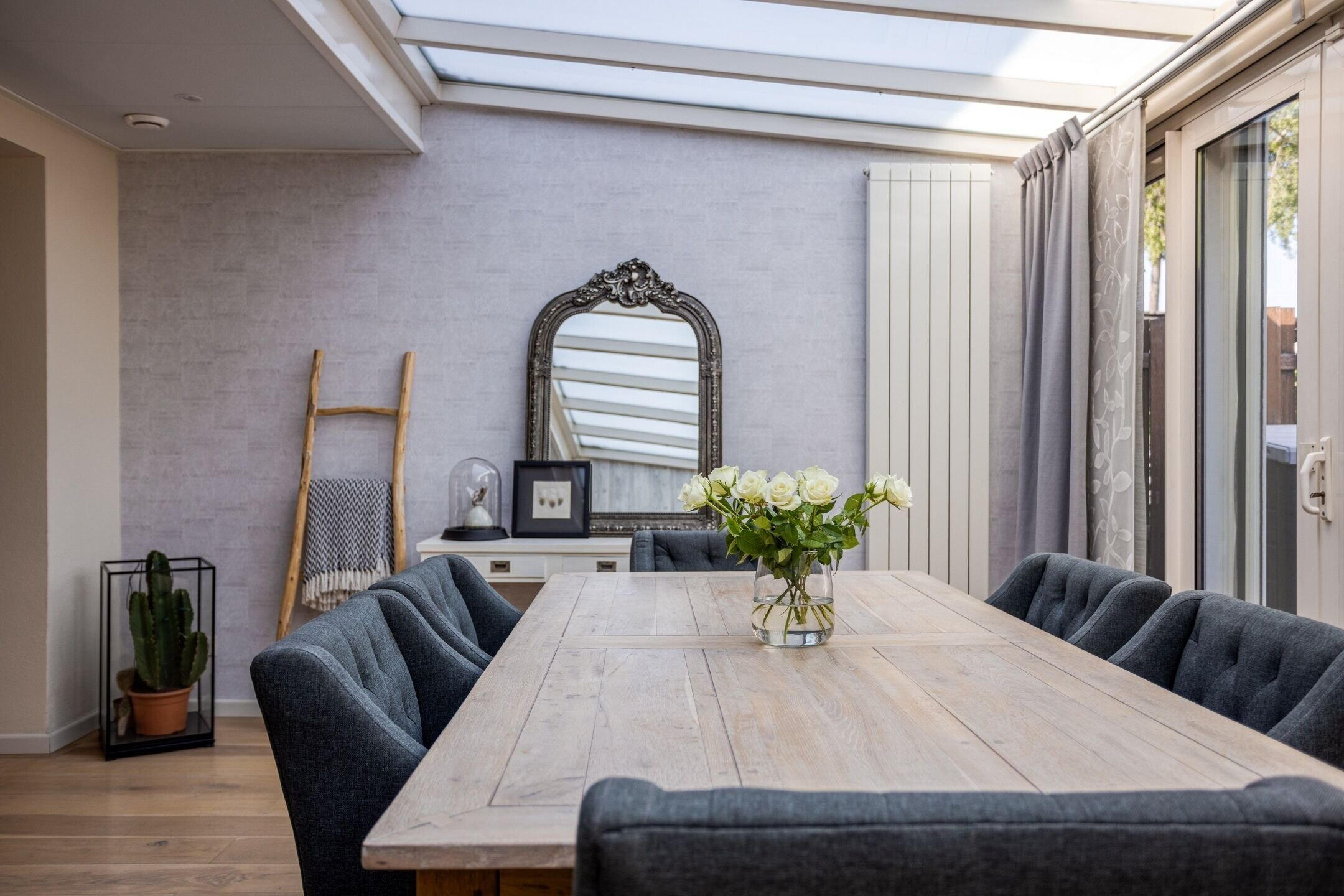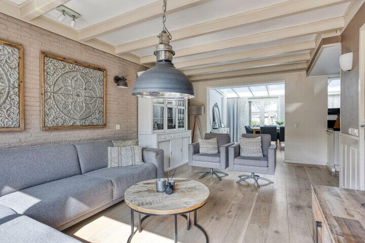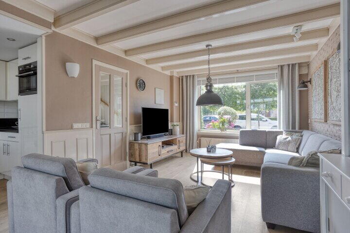 Bij binnenkomst in de woonkamer valt het gelijk op dat deze ZEER LICHT is door de daglichttoetreding door de ramen aan de voor-, achterkant en in het dak van de uitbouw.
