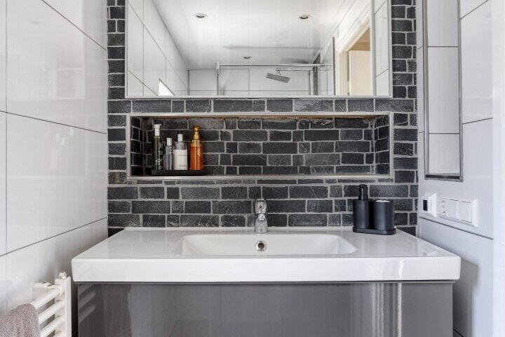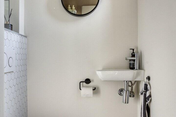 In de hal vinden we de meterkast met voldoende (7) groepen en aardlekbeveiliging, luxe toilet en een ruime kelderkast.